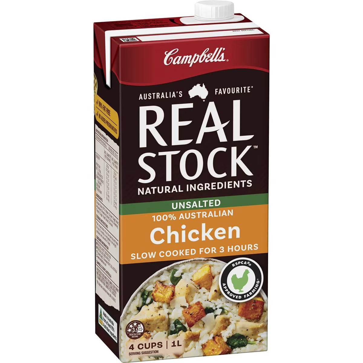 Campbell's Real Stock Natural Ingredients Unsalted is made of 100% Australian chicken slow cooked for 3 hours.