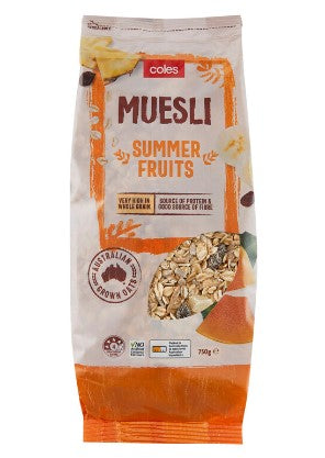 Made with Aussie oats and very high in whole grain, you will be satisfied to start your day with Coles Summer Fruits Muesli.