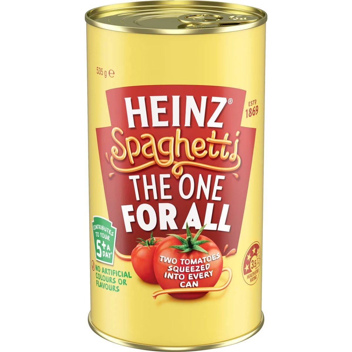Heinz Spaghetti is here to save the day with a quick and convenient meal. Containing a tomato squeezed into every serving, this spaghetti mixed with rich tomato sauce can be enjoyed by itself, on toast or with eggs. When you don't feel like cooking, don't have time or want to add a little something extra to your meal, Heinz Spaghetti is the obvious choice. Conveniently packaged in can that's sized for two servings, it's perfect as a meal for two little ones, or as a side for the whole family. Just heat up in the microwave or on the stove, and enjoy.