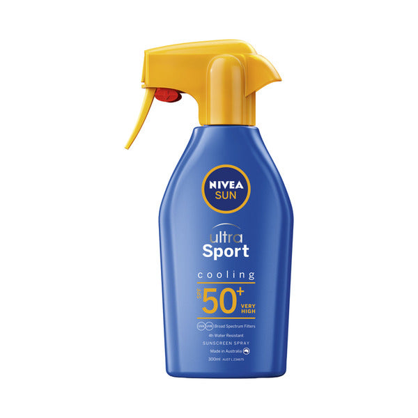 The NIVEA SUN Ultra Sport Cooling Sunscreen Spray SPF50+ is a high performance, long lasting sunscreen designed to keep you protected when you are most active. The non-greasy, cooling formula refreshes your skin on application as well as offers broad spectrum UVA/UVB protection. Furthermore, this sunscreen has been designed to be sweat resistant, so whether you are playing sport or working in the hot sun you can be confident you are protected. All this whilst also offering 4 hours water resistance. Your skin will be protected against UVA / UVB induced skin damage and High Energy Visible Light effects such as premature skin aging. Made in Australia.