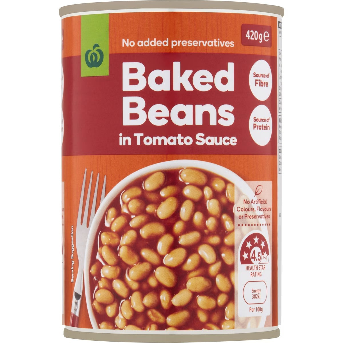 Woolworths Homebrand Baked Beans In Tomato Sauce.