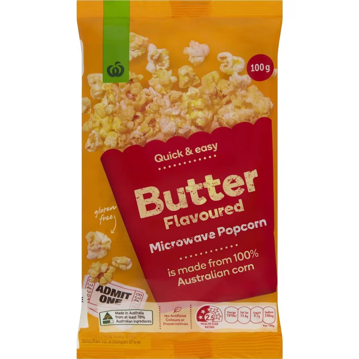 Woolworths fluffy microwave popcorn is coated with a natural butter flavour to produce a great taste every time. We only use Australian grown corn which is ready to pop to perfection!
